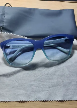 Usati massimo 2 3 volte. Occhiali da sole blu della Tommy Hilfiger, in condizioni perfette Completi di astuccio nero e pezza per pulizia bianca. Così come si vede in foto. Dimensioni 57, 17, 140.