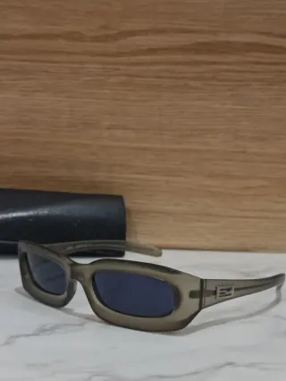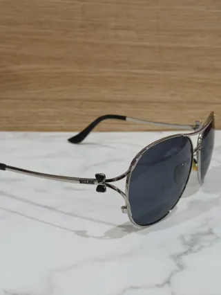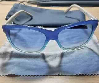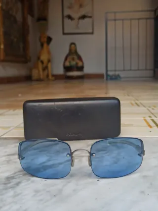 Occhiali da sole con lenti azzurre e montatura argento. - Design senza montatura. - Montatura in metallo sottile. - Lenti sfumate. Qualche piccolissimo segno impercettibile, vedere foto