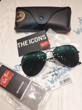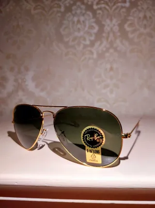 Iconici occhiali da sole Ray-Ban modello Aviator. Nuovi compresi di tutto senza cartellino. - Montatura color oro. - Lenti verdi. - Logo Ray-Ban sulla lente sinistra.