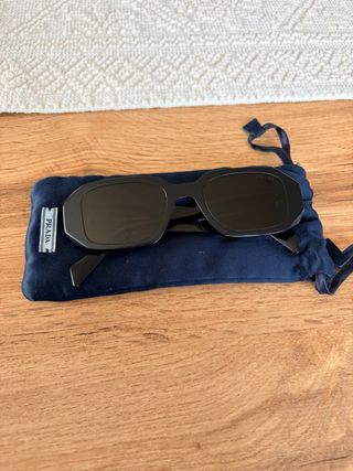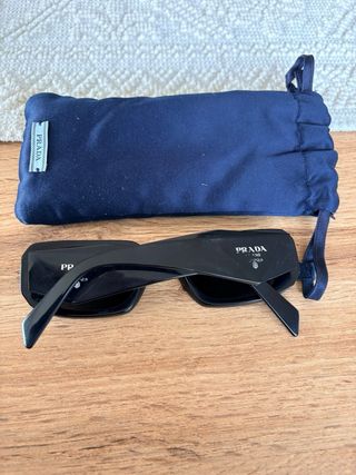 Occhiali da sole Prada con montatura nera. - Montatura squadrata. - Lenti scure. - Custodia in tessuto blu inclusa. Scritta Prada sbiadita sull’astina destra come mostrato in foto