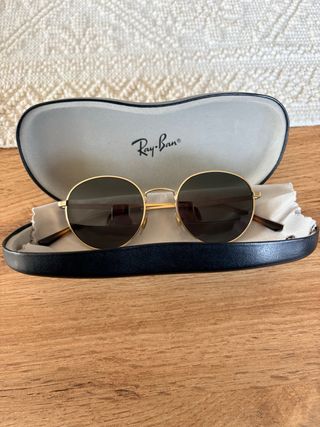 Occhiali da sole Ray-Ban modello Round con montatura dorata. - Montatura in metallo color oro. - Lenti rotonde con finitura scura. - Aste sottili con terminali tartarugati. Lenti verde scuro non originali RayBan, li utilizzavo da vista e poi ho cambiato le lenti con queste da sole. Utilizzati pochissimo
