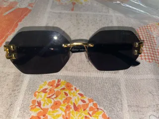 Eleganti occhiali da sole con montatura dorata e lenti nere. Il design senza montatura conferisce un look moderno e sofisticato. - Montatura in metallo color oro. - Lenti sfumate nere. - Forma esagonale delle lenti.
