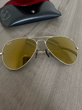 Occhiali da sole vintage Ray-Ban. Montatura color oro. Custodia in pelle beige inclusa. Segni di usura sulle stanghette come da foto Occhiali da sole vintage con montatura nera e lenti grigie. Custodia rigida nera inclusa Montatura in acetato. Entrambi con design classico e intramontabile.