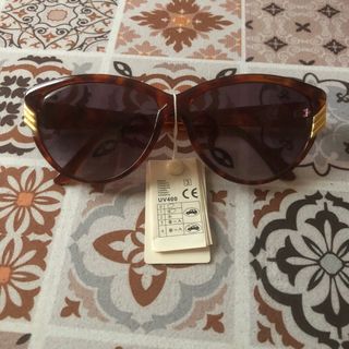 Occhiali da sole anni ‘90 nuovi ancora con cartellino. Montatura marrone tartarugato con dettagli color oro, lenti leggermente sfumate.