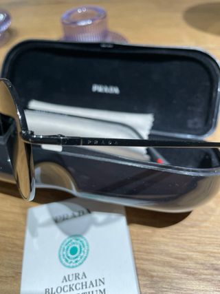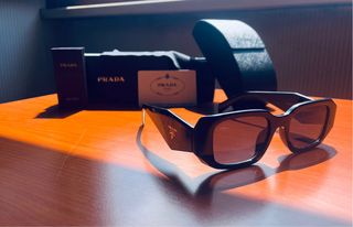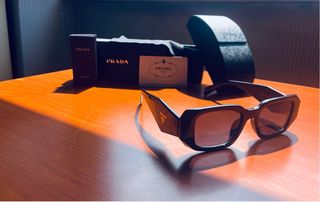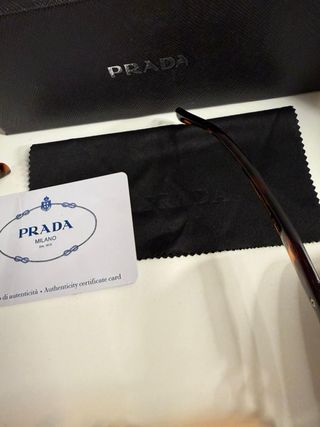 Occhiali da sole Prada originali, completi di scatola e custodia. - Montatura in acetato nero. - Lenti con protezione UV. - Logo Prada sulle aste.
