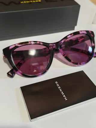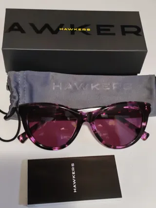 Occhiali da sole Hawkers con montatura colorata. - Montatura in acetato con sfumature viola e nere. - Nuovi mai usati. - sacchetto protettivo e scatola originali inclusi.