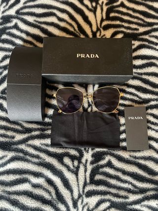 Eleganti occhiali da sole Prada con montatura color oro. - Montatura metallica. - Lenti con sfumatura. - Custodia rigida inclusa. - Panno per la pulizia.