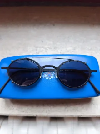 Occhiali da vista in metallo con clip-on. - Montatura rotonda. - Dettaglio a doppio ponte. - Clip-on con lenti grigio scure. - Clip-on estraibile con gancetti.