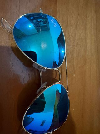 Occhiali da sole Ray-Ban con lenti a specchio. - Montatura dorata. - Lenti con riflessi blu e verdi.