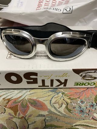 Occhiali da motociclista in stile retro e vintage. La montatura è argentata e i. Metali e le lenti sono nere. - Design ispirato agli occhiali da aviatore. - Fascia elastica regolabile per una vestibilità comoda.
