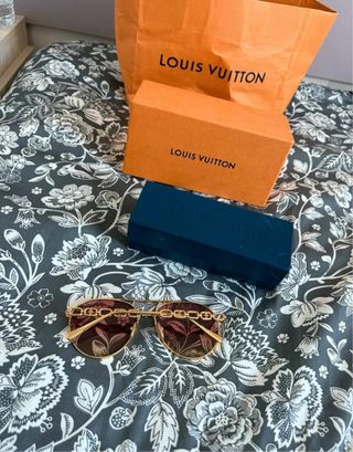 Eleganti occhiali da sole Louis Vuitton con montatura color oro e lenti sfumate. - Montatura metallica color oro. - Lenti con tonalità rosa/marrone. - Design a goccia (aviator). Occhiali da sole Louis Vuitton, con certificato di autenticità e ricevuta, acquistati l'11 giugno 2021. Indossati molto raramente, in ottime condizioni, senza graffi, sempre conservati nella loro custodia.