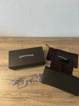 Occhiali da vista Chrome Hearts con montatura trasparente. - Montatura in acetato trasparente. - Logo Chrome Hearts inciso sulle aste. - Custodia rigida nera. - Panno per la pulizia. - Scatola originale.