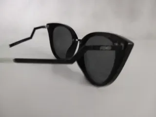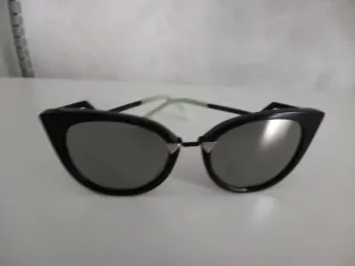 Montatura in acetato nera con lenti grigie e hardware in metallo gold, larghezza 14 cm. Condizioni in ottimo stato si segnala che qualche leggero segnetto sull'asta sx interna e sull'asta esterna dx come da foto.