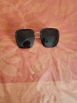 Occhiali da sole con un design unico a forma di cuore. - Montatura nera con dettagli di paillettes. - Lenti scure.