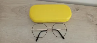 Occhiali da vista con un design moderno ed elegante. - Montatura metallica con dettagli dorati. - Lenti trasparenti. - Include custodia protettiva gialla.