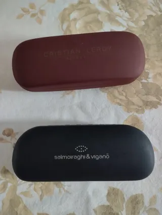 Set di due custodie rigide per occhiali. - Una custodia di colore marrone con logo CRISTIAN LEROY EYEWEAR. - Una custodia di colore nero con logo salmoiraghi & vigano. - Ideali per proteggere i tuoi occhiali.