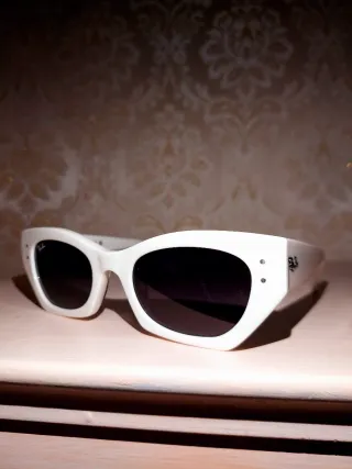 Occhiali da sole Ray-Ban con montatura bianca. Nuovi compresi di tutto senza cartellino. - Design cat-eye. - Dettagli con borchie sulle aste.
