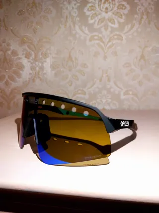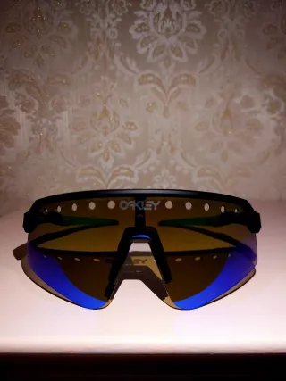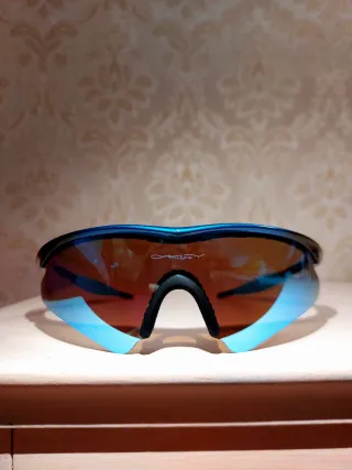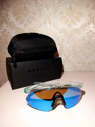 Occhiali da sole Oakley con lenti a specchio blu. Nuovi compresi di tutto senza cartellino. - Montatura nera. - Lenti a specchio. - Design avvolgente.