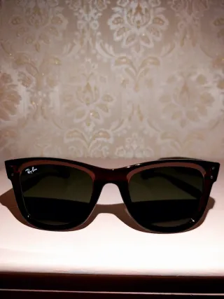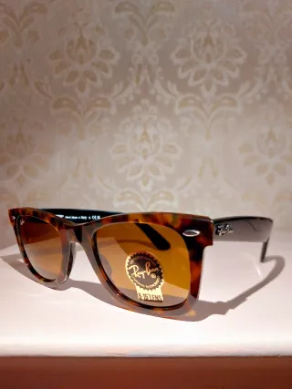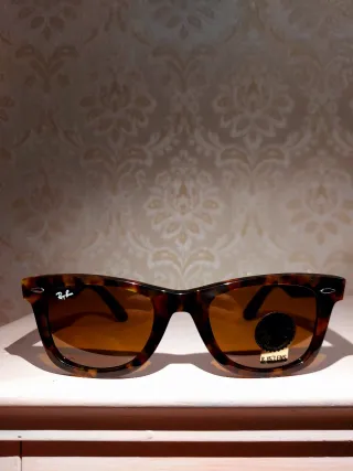 Occhiali da sole Ray-Ban con montatura tartarugata. Nuovi compresi di tutto senza cartellino. - Montatura in acetato. - Lenti scure. - Design iconico.