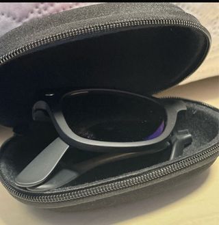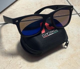 Occhiali da sole pieghevoli con montatura nera. - Montatura in plastica resistente. - Lenti con riflessi blu. - Custodia rigida inclusa. la lente non è graduata ma è solo da solo e non da vista.