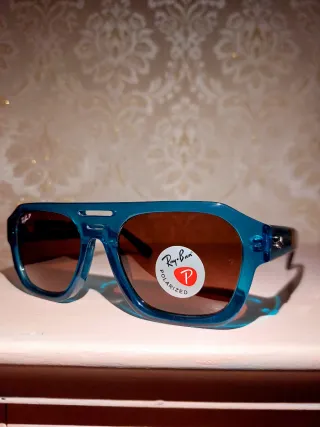 Occhiali da sole Ray-Ban con montatura blu e lenti marroni. Nuovi compresi di tutto senza cartellino - Lenti polarizzate. - Logo Ray-Ban sulla lente destra. - Montatura resistente.