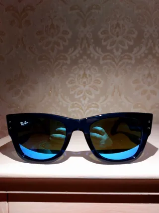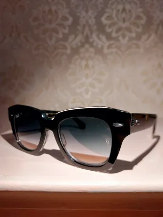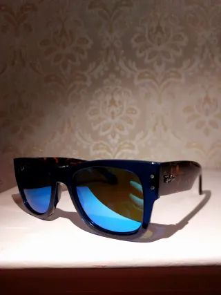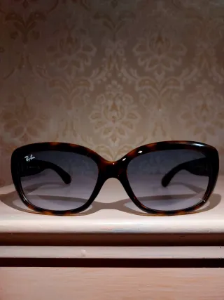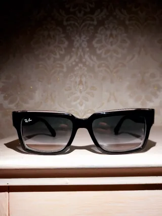 Occhiali da sole Ray-Ban con montatura color tortora e lenti sfumate azzurre. Nuovi compresi di tutto. - Montatura in acetato. - Lenti con protezione UV.