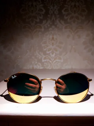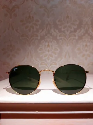 Occhiali da sole Ray-Ban con montatura rotonda e lenti verdi. Nuovi compresi di tutto senza cartellino. - Montatura color oro. - Lenti con tonalità verde. - Design classico e intramontabile.