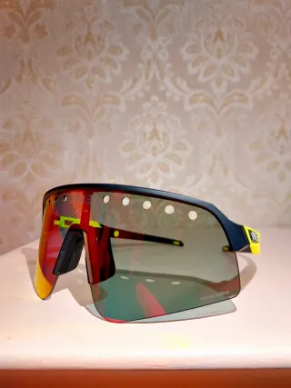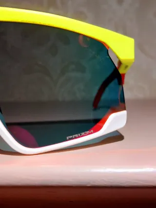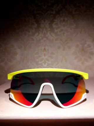 Occhiali da sole Oakley con un design audace e colorato. Nuovi compresi di tutto senza cartellino. - Montatura gialla vivace. - Lenti sfumate multicolore con riflessi. - Stile avvolgente per una copertura ottimale.