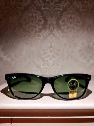 Occhiali da sole Ray-Ban con montatura nera e lenti verdi. Nuovi compresi di tutto senza cartellino. - Montatura in acetato lucido. - Lenti con protezione UV. - Design iconico Wayfarer.