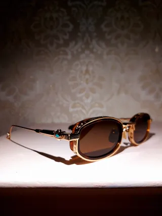 Occhiali da sole Jacques Marie Mage con montatura color oro e lenti marroni. Ottima alternativa per chi non vuole spendere tantissimo per un paio di occhiali costosi. Nuovi compresi di tutto senza cartellino. - Dettagli in oro sulla montatura. - Lenti con sfumatura marrone. - Design unico e distintivo.