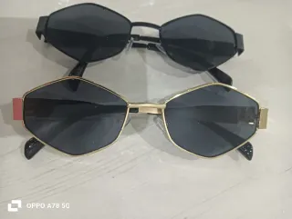 Eleganti occhiali da sole con una forma geometrica unica. - Montatura in metallo color oro. - Lenti nere. - Design moderno e accattivante.