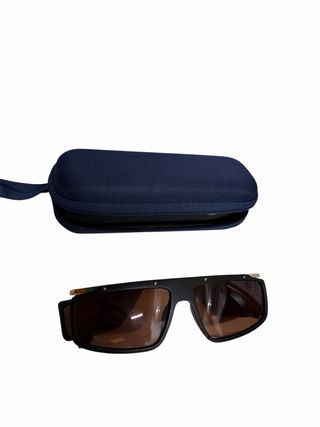 Occhiali da sole con montatura nera e lenti marroni. - Montatura squadrata. - Dettagli dorati sulle aste. - Custodia protettiva inclusa.