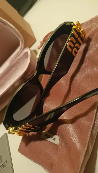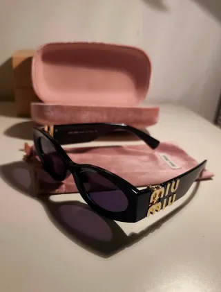 Eleganti occhiali da sole Miu Miu con montatura nera e dettagli dorati. Perfetti per completare ogni look. - Montatura in acetato nero. - Lenti viola - Logo Miu Miu dorato sulle aste. Regalo del mio ex, voglio disfarmene