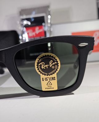 Iconici occhiali da sole Ray-Ban Wayfarer con finitura nera opaca. - Montatura in acetato. - Lenti G-15. - Logo Ray-Ban sulle aste.