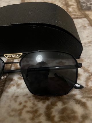 Occhiali da sole Prada neri, completi di custodia e panno. - Montatura in metallo. - Lenti scure. - Logo discreto sulle aste.