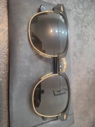 Occhiali da sole Ray-Ban modello Clubmaster. - Montatura in acetato nero e dettagli in metallo dorato. - Lenti scure per una protezione ottimale.