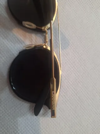 Occhiali da sole Carrera con montatura nera e dettagli dorati. - Montatura in acetato nero. - Lenti scure. - Ponte e aste in metallo color oro.
