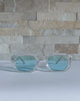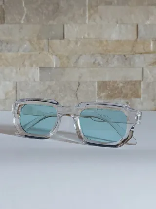 Occhiali da sole con montatura trasparente e lenti azzurre. - Montatura squadrata. - Lenti colorate.
