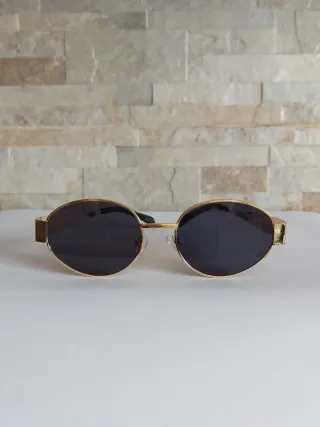 Occhiali da sole eleganti con montatura color oro e lenti nere. - Montatura in metallo color oro. - Lenti con protezione UV. - Design ovale. - Logo Celine sulle aste.