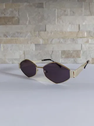 Occhiali da sole con montatura dorata e lenti scure. - Design geometrico a forma di esagono. - Montatura in metallo color oro. - Lenti con tonalità scura.