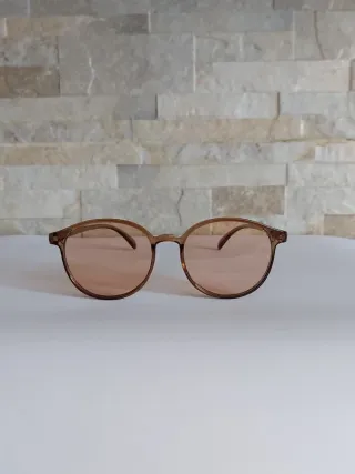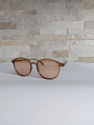 Occhiali da sole con montatura marrone e lenti colorate. - Montatura rotonda. - Lenti con tonalità rosata.