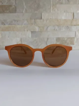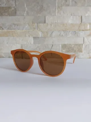 Occhiali da sole con montatura rotonda e lenti marroni. - Montatura in plastica arancione. - Lenti con tonalità marrone.