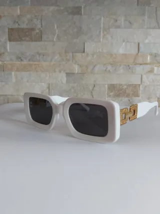 Eleganti occhiali da sole con montatura bianca e dettagli dorati sulle aste. Un accessorio di tendenza per completare il tuo look. - Montatura squadrata. - Lenti scure. - Dettagli decorativi sulle aste.