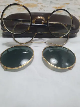Un paio di occhiali da vista vintage Montatura tartarugata e dettagli dorati. Lenti rotonde graduate. Gli occhiali sono dotati di una clip polarizzata Polaroid con lenti 100% UV di colore grigio da agganciare lateralmente nei 4 lati della montatura degli occhiali, come da foto. Lunghezza asta cm.11,5 ( le aste sono flessibili e si possono modellare), ponte distanza tra le lenti cm.2,3, calibro distanza orizzontale lente cm. 4,2 (diametro). Distanza totale da asta ad asta cm.12
