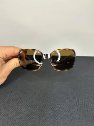 Occhiali da sole Ray-Ban con montatura tartarugata. - Montatura in acetato. - Lenti marroni sfumate. - Custodia originale inclusa.