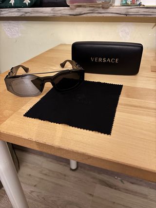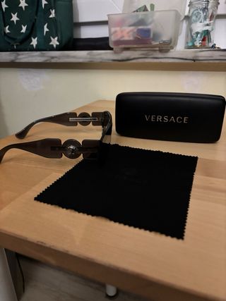 Occhiali da sole Versace con montatura nera. - Design moderno e audace. - Lenti scure per una protezione ottimale. - Custodia originale inclusa.