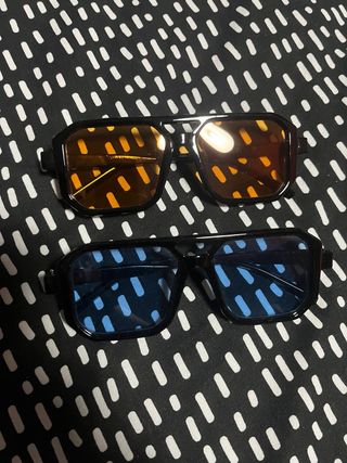 Set di occhiali da sole con lenti colorate. - Montatura nera. - Lenti arancioni. - Lenti blu.