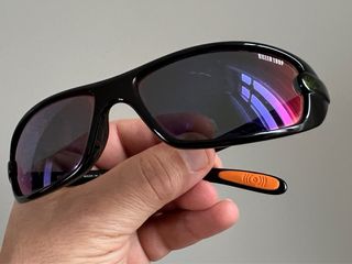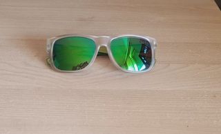 Quechua Occhiali da sole rettangolari. La montatura è di colore grigio trasparente e le lenti Verdi/Blu a specchio. Usati poco, sono in ottime condizioni.