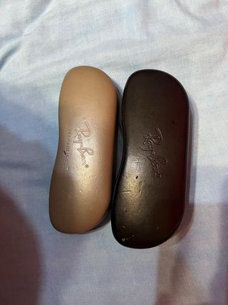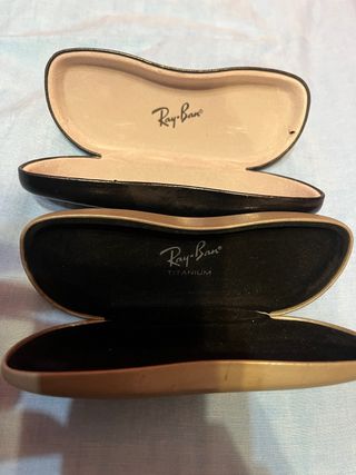 Set di due custodie per occhiali Ray-Ban. - Una custodia è nera con interno beige. - L'altra custodia è color grigio con interno nero e scritta TITANIUM.