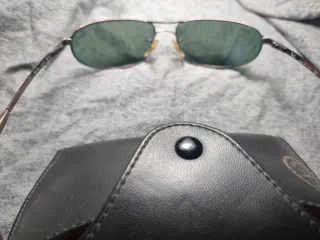 Ray-Ban Aviator vintage by Bausch & Lomb USA. Montatura dorata con aste sottili a filo ricurvo. Lenti verdi classiche G-15 in vetro minerale, verde bottiglia , qualità B&L . Marcature originali incise sulla montatura e lenti (come da foto). Lente sx con piccola scheggiatura (foto).